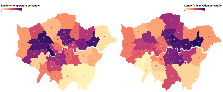 The United Kingdom (UK) is no exception. Dense urban areas like London – especially deprived neighbourhoods with little green space, suffer from being significantly warmer than rural areas. Those same areas often house the populations most vulnerable to the health effects of heat. In Greater London, ethnic minorities, children, and low-income groups live in areas with land surface temperatures up to 4°C higher than wealthier, whiter communities.